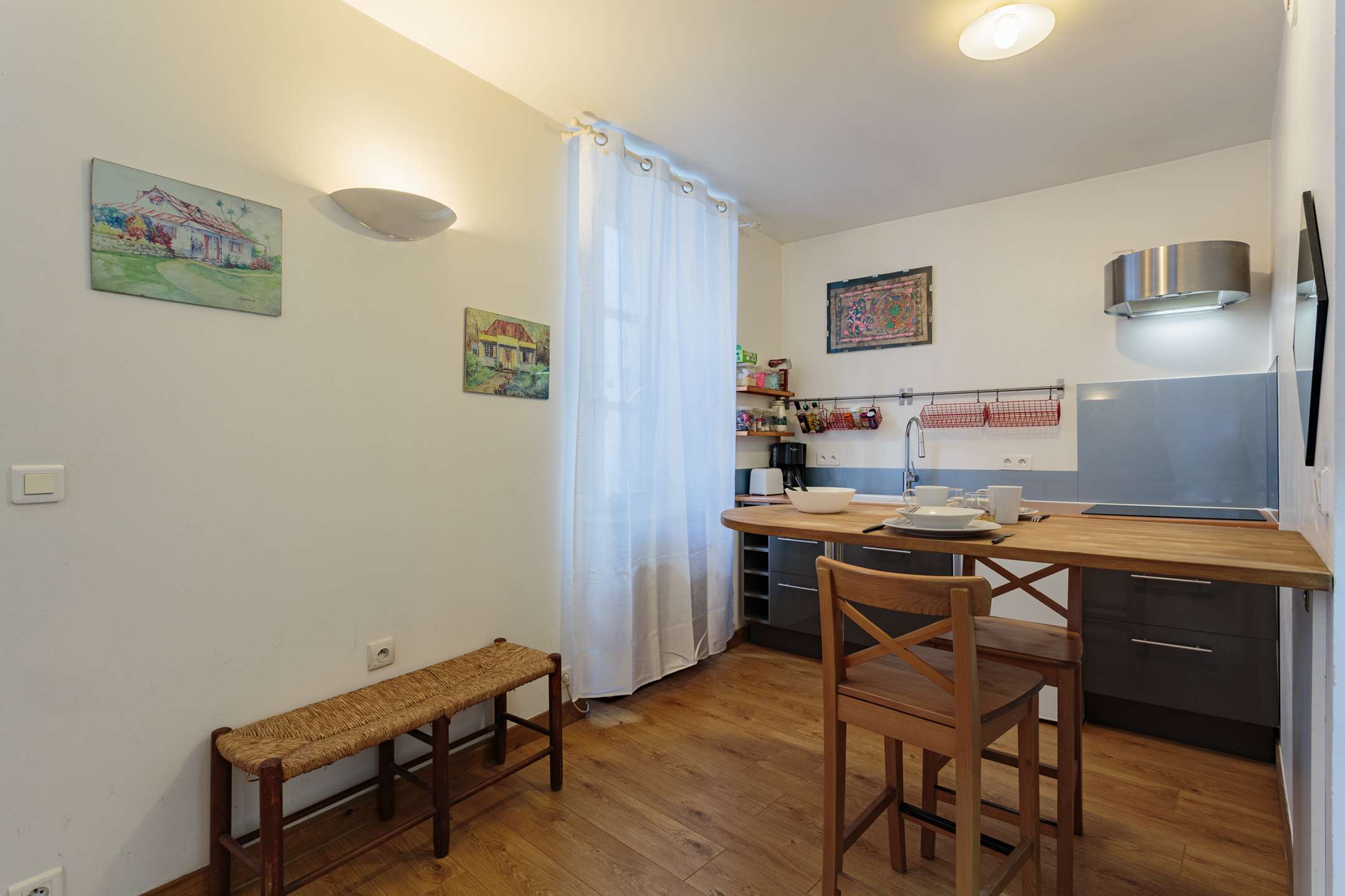 Modern studio. Street-level, simply furnished. Living room double sofa bed. Open kitchen with hotplates.