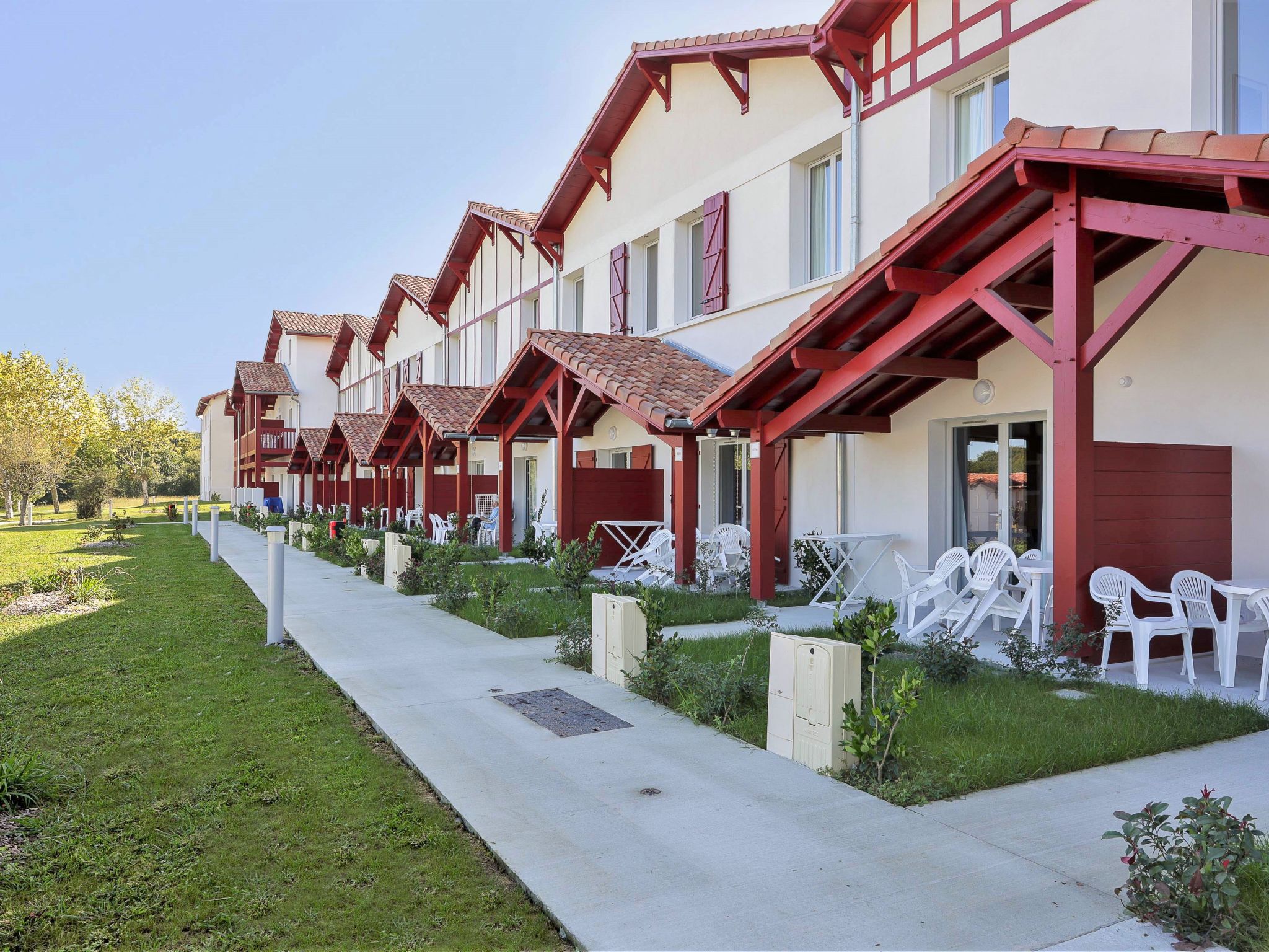 Residence "Le Domaine d'Uhaina", built in 2021. 94 apartments in the residence. 7 km from the centre of Urrugne, 8 km from the centre of Saint Jean de Luz, 25 km from the centre of Biarritz, 1 km from the sea, 5 km from the beach, in a cul-de-sac. For shared use: property 4 ha (fenced), swimming pool, indoor pool heated, fenced (9 x 3 m, depth 150 cm, seasonal availability: 01.Jan. - 31.Dec.). Shower/WC in the pool area, boccia, terrace, garden furniture. In the complex: reception, WiFi, sauna, fitness room, hamam table tennis, sun terrace, washing machine, tumble dryer (for shared use, extra). Breakfast on request (extra). Parking (limited number of spaces) on the premises. Shop 5 km, supermarket 8 km, sandy beach "Hendaye" 5 km. Golf course (18 hole) 29 km. Nearby attractions: Hendaye 5 km, Saint Jean de Luz 8 km, Guéthary 16 km, La Rhune 19 km, Biarritz 23 km, Espagne 8 km. Please note: the photograph shows a typical example. The holiday properties may differ in living space, floorplan, equipment and furnishing.